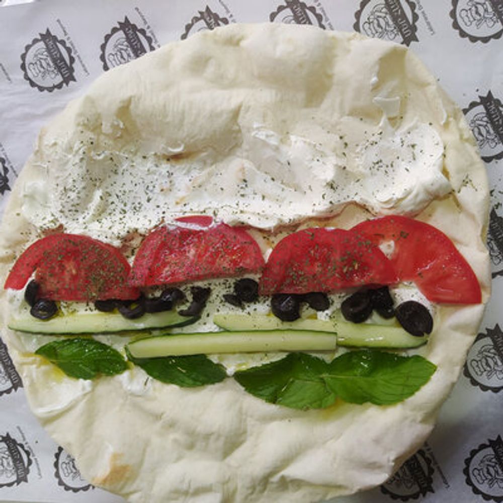 Свежевыпеченный хлеб с йогуртом и со свежими ломтиками помидора и огуца,листями свежой мяты и с оливками