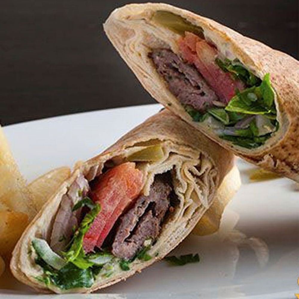 Говяжий фарш со специями, хумус, соленые огурцы, биваз, помидоры