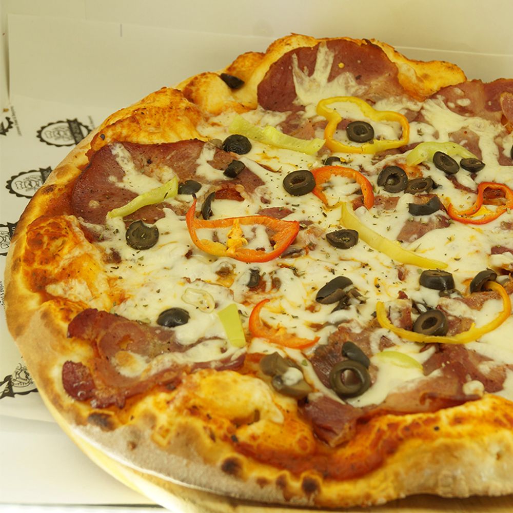 Томатная паста, ветчина, грибы, перец, оливки, сыр моцарелла