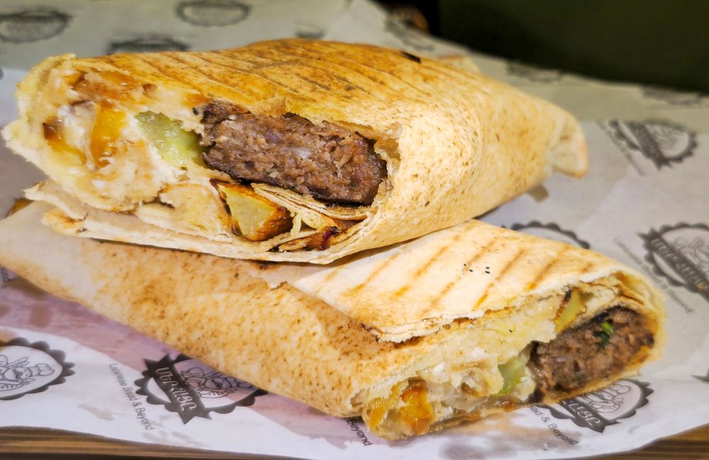 сыр чечил, котлета из говядины, сольеные огурцы и картошка фри