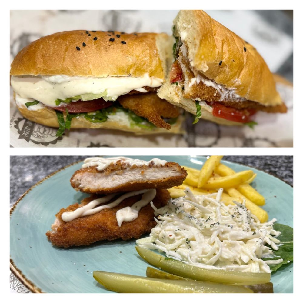 Вариант Сэндвича - куриное филе, листья салата, соленые огурцы, помидоры и фирменный соус Вариант в тарелке - куриное филе, соленые огурцы, картофель фри, салат из капусты