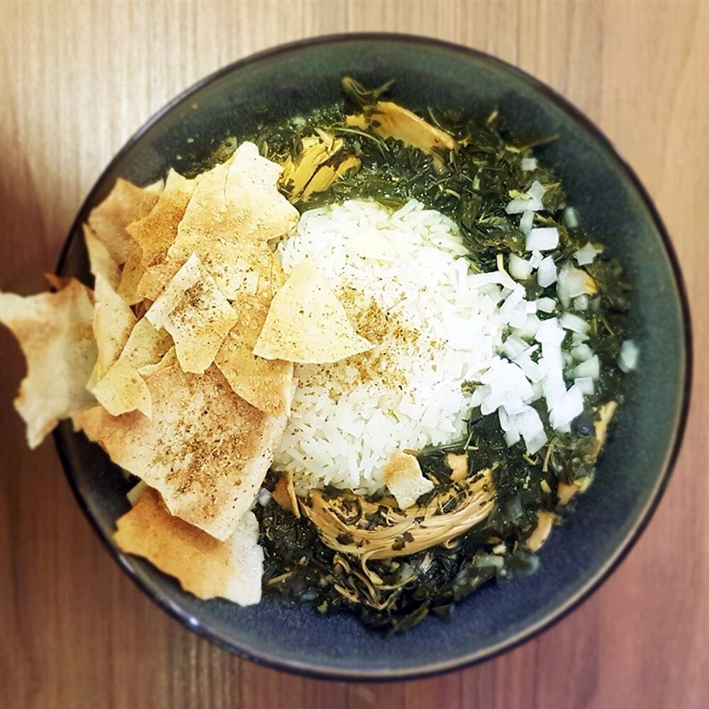 Курица с зелеными листьями, подается с рисом, приготовленным на пару, хлебом и уксусным соусом