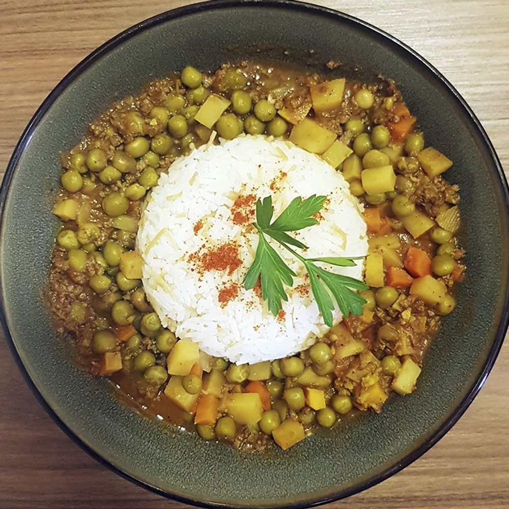 Говядина С Тушеным Горохом Горох и говядина, приготовленные в томатном соке, подаются с рисом на пар