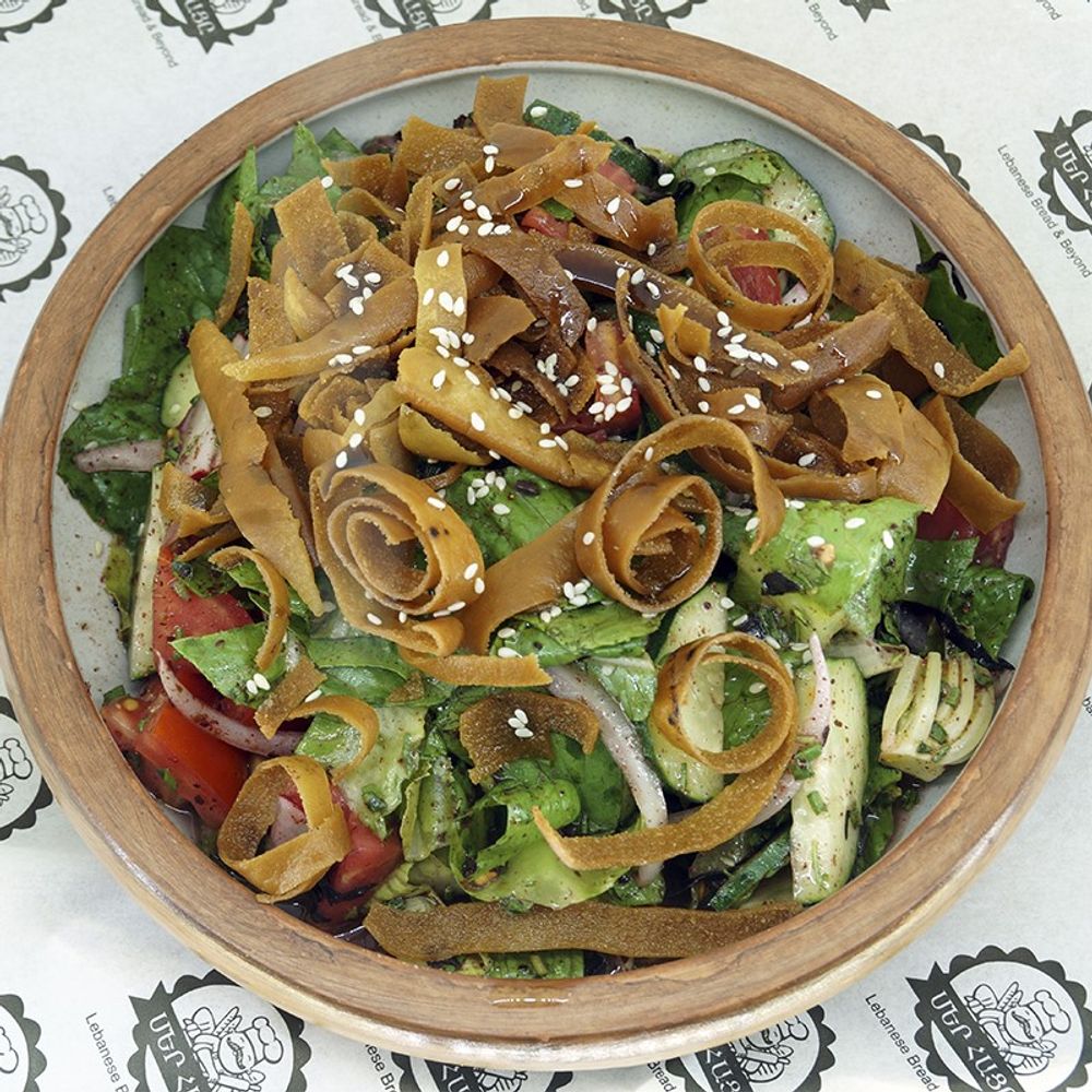 Помидоры, огурец, листья салата, лук, кунжут, специи, хрустящий хлеб, лимонный сок, Сумах